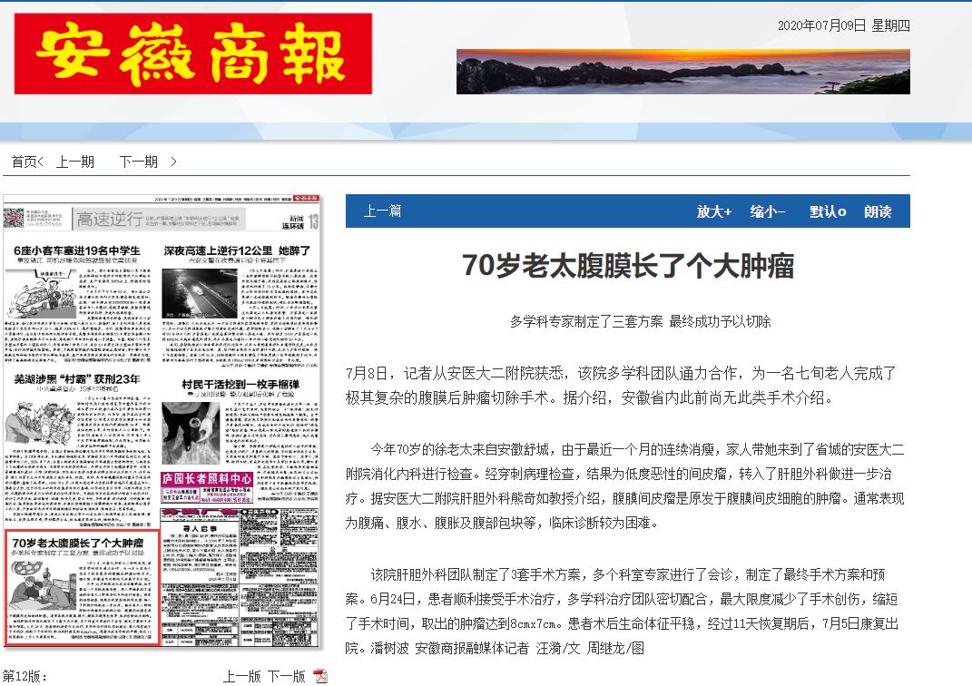 今年70岁的徐老太来自安徽舒城,由于最近一个月的连续消瘦,家人带她来到了省城的安医大二附院消化内科进行检查。经穿刺病理检查,结果为低度恶性的间皮瘤,转入了肝胆外科做进一步治疗。据安医大二附院肝胆外科熊奇如教授介绍,腹膜间皮瘤是原发于腹膜间皮细胞的肿瘤。通常表现为腹痛、腹水、腹胀及腹部包块等,临床诊断较为困难。