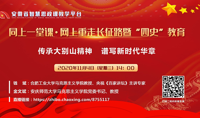 四、及时做好“网上同上一堂课”活动的人员组织工作。11月4日下午,安徽省委教育工委组织“网上同上一堂课”活动,请各部门、各单位从不同层面组织安排师生观看,(直播链接:https://zhibo.chaoxing.com/8755117)相关新闻、视频、工作总结等素材交宣传部。