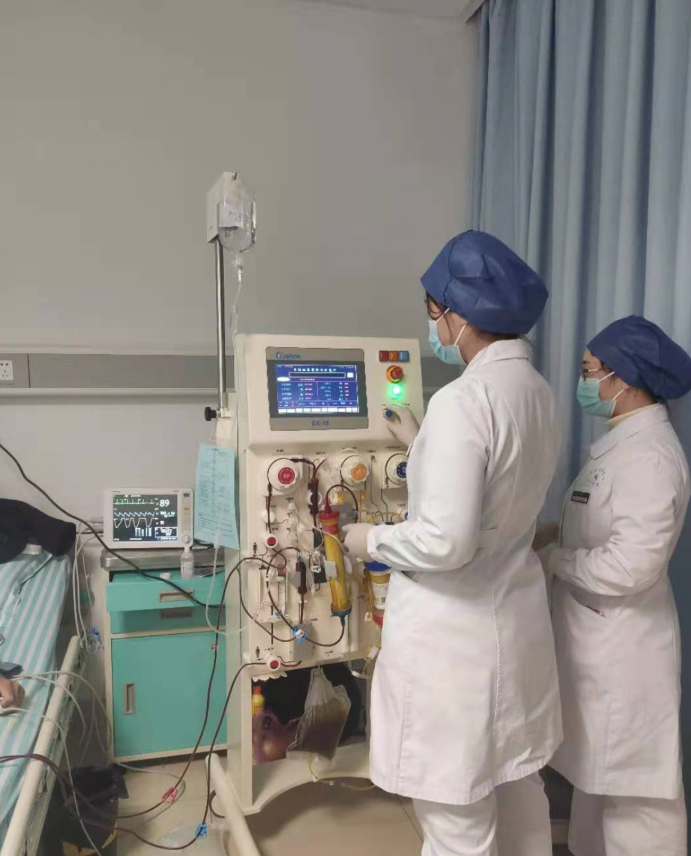 经感染肝病科专家团队讨论,认为患者有“人工肝”治疗指征。将病情及治疗方案告知病人及家属后,果断为患者实施“人工肝”技术——DPMAS(双重血浆分子吸附系统)联合PE(血浆置换),全力救治该患者。一场“换血”大行动迅速开展,血浆分离器将人体引流的全血分离为血浆和血细胞,血细胞回输体内,分离出的血浆将胆红素和胆汁酸及炎性介质吸附后,回输入患者体内,完成第一个步骤。