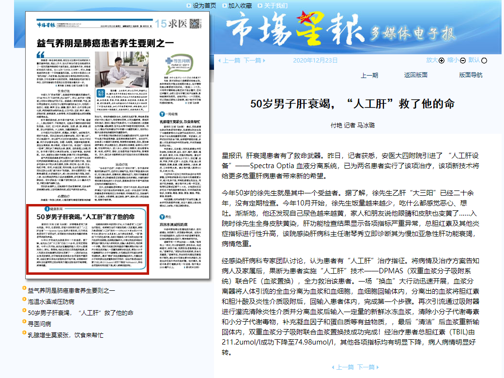 市场星报:50岁男子肝衰竭,“人工肝”救了他的命