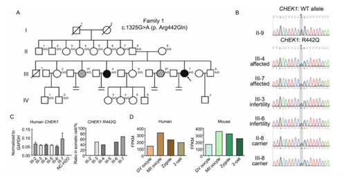 今年,联合研究团队在临床上发现一个表现为受精卵卵裂失败的女性不孕家系,并通过全外显子测序分析找到潜在的致病突变CHEK1 R442Q。该家系中女性不孕症患者均携带CHEK1的杂合突变,呈常染色体显性遗传。突变携带者除表现为不孕外,无其他疾病史,其他体细胞及身体功能均未受影响。