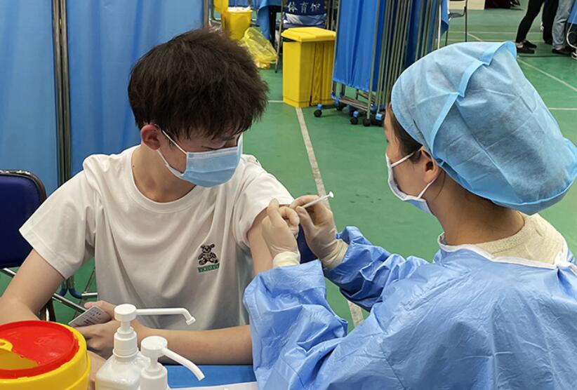 新冠疫苗接种现场,医护人员为学生登记信息。袁学艺摄