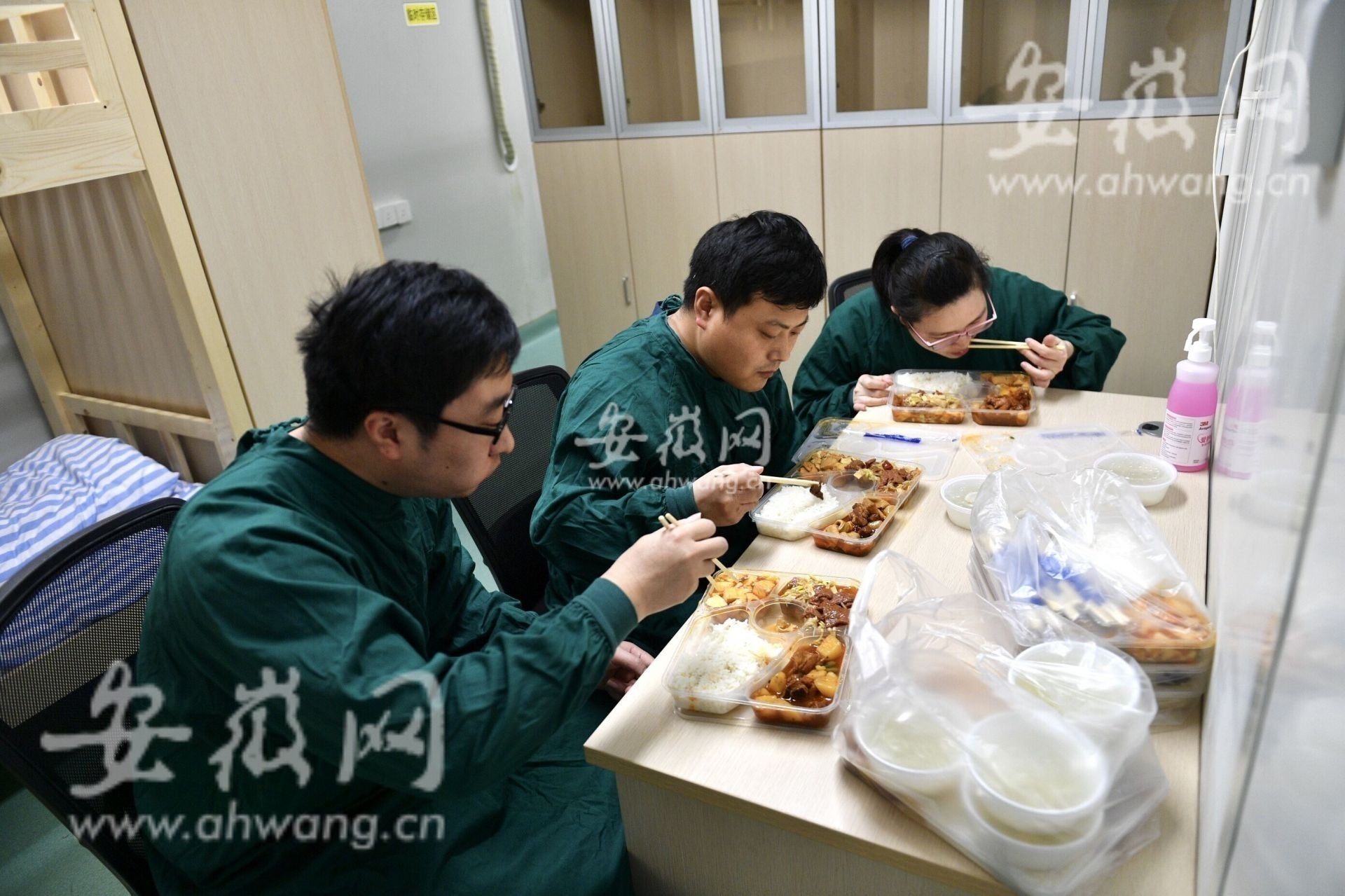 此时在实验室外的值班室,桌子上摆放着盒饭。大概20分钟时间,检验科医生们吃完盒饭后,继续进入实验室进行核酸检测工作。