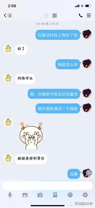 可喜的是,在中转仓隔离期间,杨同学获得了心仪院校的复试机会。但环境限制、材料缺失、心态不稳等接踵而至的种种难题,让她的情绪更加低迷。薛兴欣得知情况后立刻给予安抚,并针对其复试问题积极帮助准备复试材料、联系复试院校,协助杨同学解决方舱医院复试场地、网络等实际问题。最终,在中转仓的一个小走廊里,杨同学完成了研究生复试线上面试。当收到录取通知时,她激动地说:“如果没有薛老师的鼓励与帮助,我可能会放弃此次复试。那个走廊,是我一个人的考场,也是许多人的努力,谢谢母校,谢谢老师!”