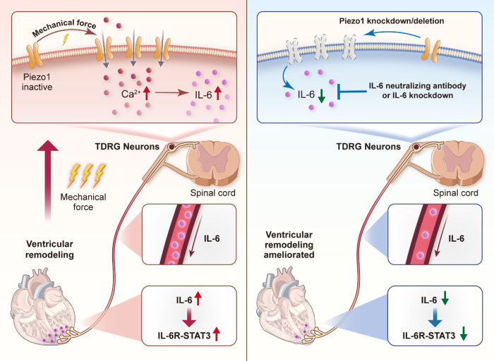 该研究发现,心脏感觉神经元胞体所在的胸段背根神经节(TDRG)中Piezo1的表达水平在梗死后心室重构过程中显著增加,与疾病程度具有强相关性。在心肌梗死后心室重构病理过程中,Piezo1与炎症因子IL-6介导的神经源性炎症级联反应形成了一个新的“神经-免疫-心脏”轴。此发现为防治梗死后心室重构或心力衰竭提供了新的靶点,具有重要的理论意义和临床价值。