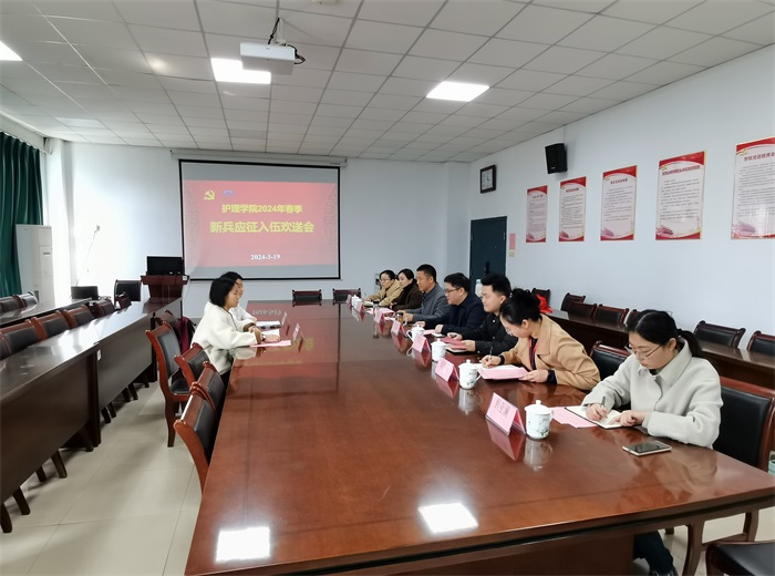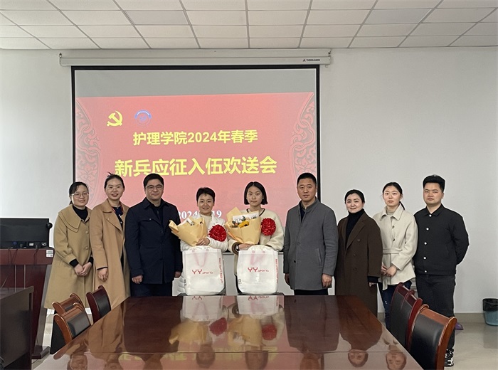 3月19日上午,护理学院召开2024年春季新兵应征入伍欢送会,为即将踏上光荣之旅、开启军营生涯的两名新兵送行。该院党委书记薛磊、院党委副书记王磊,校学生处相关工作人员以及学院入伍新兵等参加欢送会,王磊主持欢送会。