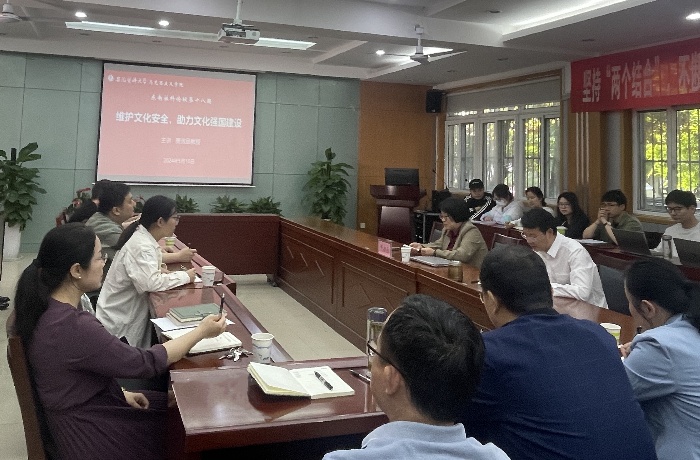 5月10日上午,东南社科论坛(第十八期)在马克思主义学院一楼会议室举行。本期论坛邀请上海师范大学马克思主义学院副院长、博士生导师、国家社会科学基金重大项目首席专家贾淑品教授,作题为《维护文化安全,助力文化强国建设》主题报告。该院副院长储著源主持报告会。