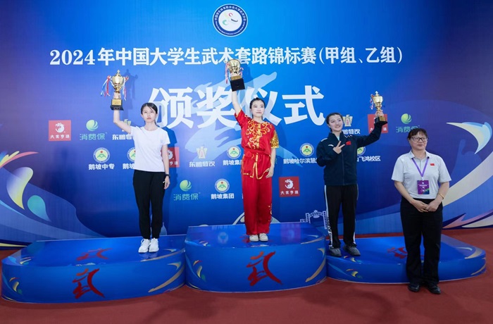 6月2日至9日,由中国学生体育联合会主办、哈尔滨市体育局承办的2024年中国大学生武术套路锦标赛(甲组、乙组)在黑龙江省哈尔滨市举行。我校学子发挥出色收获多个奖项,其中公共卫生学院2021级博士研究生滕玉竹斩获2项冠军和1项亚军,留学生共获得3项一等奖,我校获得女子甲组团体总分亚军和体育道德风尚奖。