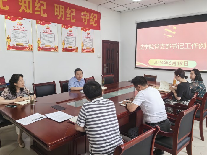 6月19日下午,法学院召开党支部书记工作例会,集中学习习近平总书记关于全面加强党的纪律建设的重要论述,传达学校党建工作6月例会会议精神,总结学院上半年党建工作开展情况以及存在的问题。院党委书记夏会林主持会议,并就2024年下半年学院党建工作提出具体要求。院党委副书记刘燕出席会议。