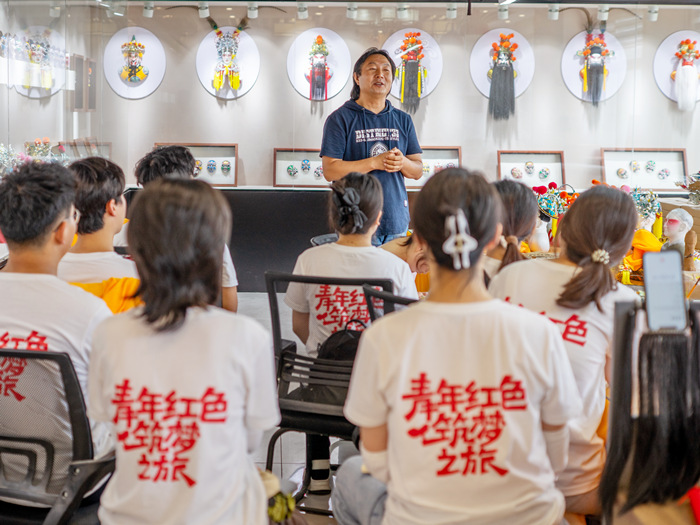 追随传统脚步,弘扬非遗文化。盔头是中国传统戏曲中剧中人物所戴各种冠帽的统称。为了解“盔头”制作工艺,感悟戏曲文化的历史价值与文化渊源,实践队前往埇桥区残疾人梦工坊,在非遗盔头制作技艺代表性传承人房兴尚工作室,和残障人士一起学习并参与制作盔头和脸谱,体会一代又一代传承人展现的工匠精神。在社区的支教课堂上,实践团成员带领儿童体验漆扇、剪纸等非遗传统技艺,让孩子们在亲身实践中,感受中华文化的博大精深。