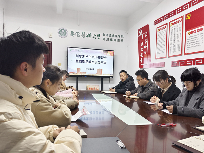 2月19日上午,巢湖临床医学院召开新学期学生班干座谈会暨寒假见闻分享会。学院领导、辅导员、班干代表、学生代表20余人齐聚一堂,围绕“基层服务使命”与“寒假实践成果”展开交流,为新学期班级建设凝聚共识、注入活力。学院党委书记贾伟华参加活动。