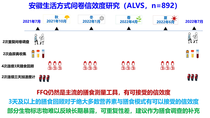 拥有一份能准确可靠的收集长期饮食习惯的调查问卷是人群营养研究成功的关键。为了服务安徽肝病研究(ALDS)自然人群队列与安徽肝癌胃癌与大肠癌研究(ALGCS)专病队列现场膳食调查工作,营养与肿瘤科研创新团队立足安徽省三山夹两平原的地理格局,以及“皖南-皖中-皖北的饮食文化区划,研发了一套包含141项食物或食物组的食物频度问卷(FFQ),基本涵盖了安徽各地区常见食物与特色食物。团队开展了1年期的安徽生活方式信效度研究(ALDS),以检查问卷能否有效的收集队列人群的饮食等行为生活方式。系列结果提示,该问卷能较为可靠地评估绝大部分膳食模式、食物及营养素,其中两种主要多酚(大豆异黄酮与木酚素)的信效度研究发表在《美国临床营养学杂志。